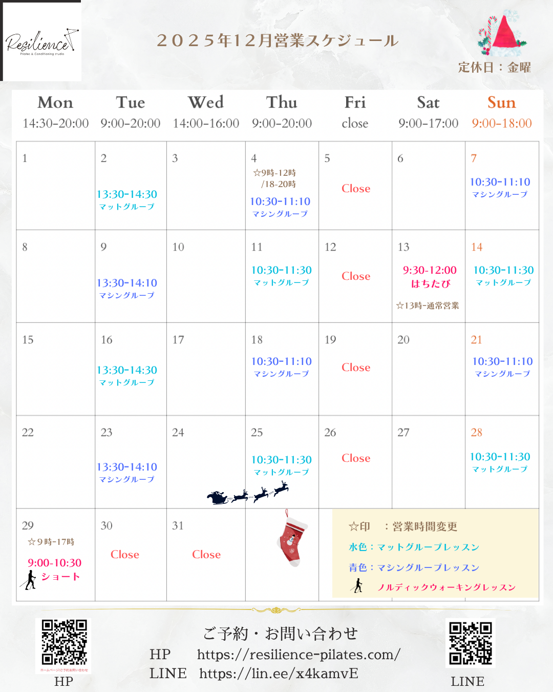 2025-11-15 / 最終更新日時 : 2025-11-15 resiliencek information 2025年12月営業スケジュール ※グループレッスンの時間帯はプライベートレッスン予約不可です。 <当店初めてのお客様>当店は会員制のピラティススタジオです。ご入会をお考えの方はまずは体験レッスンからどうぞ。 <会員の皆様>「ご予約・お問い合わせ」または […]